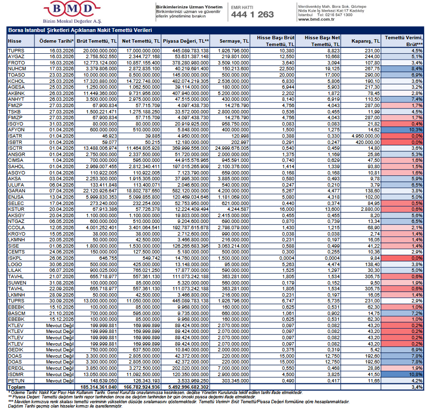BMD Araştırma'nın analizine göre, 2025 yılı kârından temettü dağıtımına dair yönetim kurulu kararı almış BİST şirketlerinin dağıtmayı planladığı nakit temettü tutarı, temettü dağıtım tarihi ve temettü verileri şu şekilde: