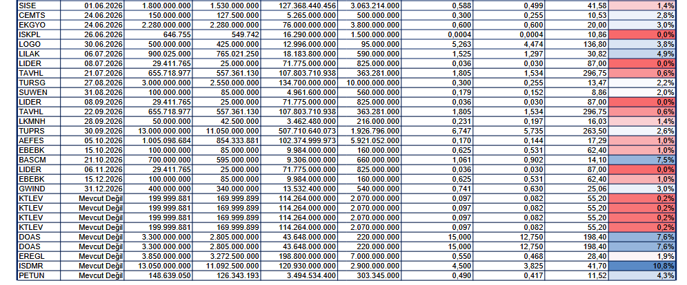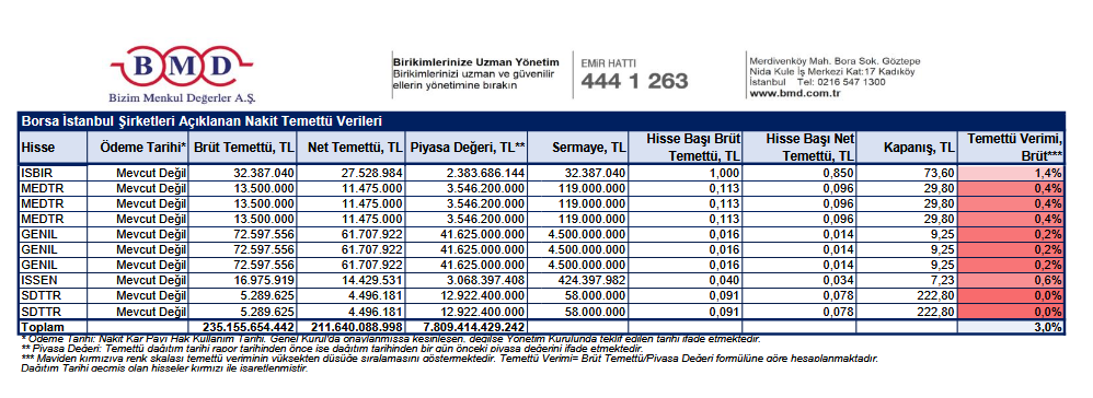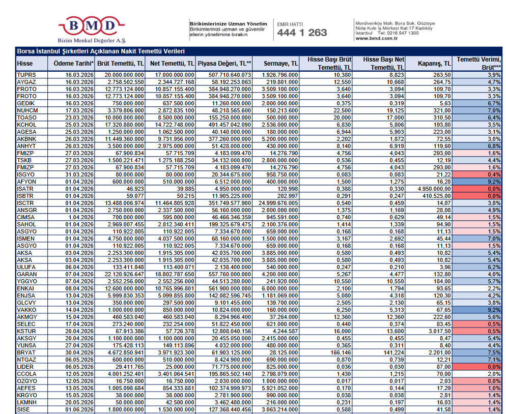 BMD Araştırma'nın analizine göre, 2025 yılı karından temettü dağıtımına dair yönetim kurulu kararı almış BİST şirketlerinin dağıtmayı planladığı nakit temettü tutarı, temettü dağıtım tarihi ve temettü verileri şu şekilde: