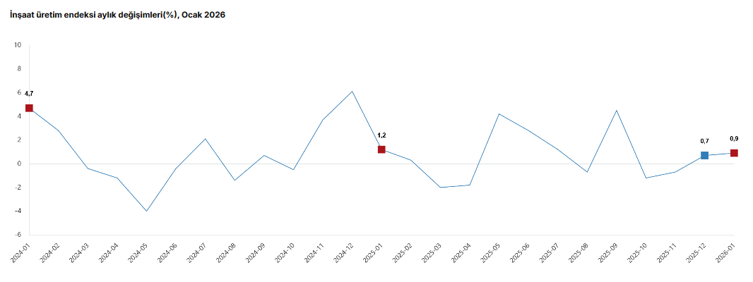 İnşaatın alt sektörleri incelendiğinde, Ocak ayında bina inşaatı sektörü endeksi aylık bazda yüzde 0,1 azalırken, bina dışı yapıların inşaatı sektörü endeksi yüzde 0,8 ve özel inşaat faaliyetleri sektörü endeksi yüzde 4,8 arttı.