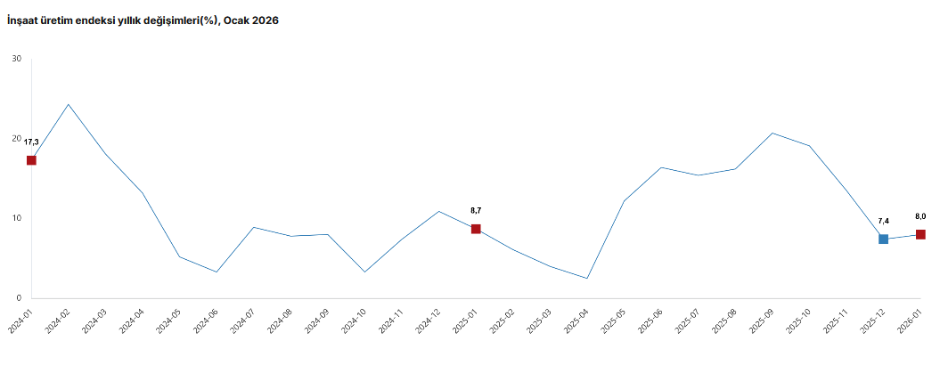 Türkiye İstatistik Kurumu’nun (TÜİK) verilerine göre; inşaatın alt sektörleri incelendiğinde, Ocak ayında bina inşaatı sektörü endeksi yıllık bazda yüzde 8,1, bina dışı yapıların inşaatı sektörü endeksi yüzde 8,8 ve özel inşaat faaliyetleri sektörü endeksi yüzde 7,1 arttı.