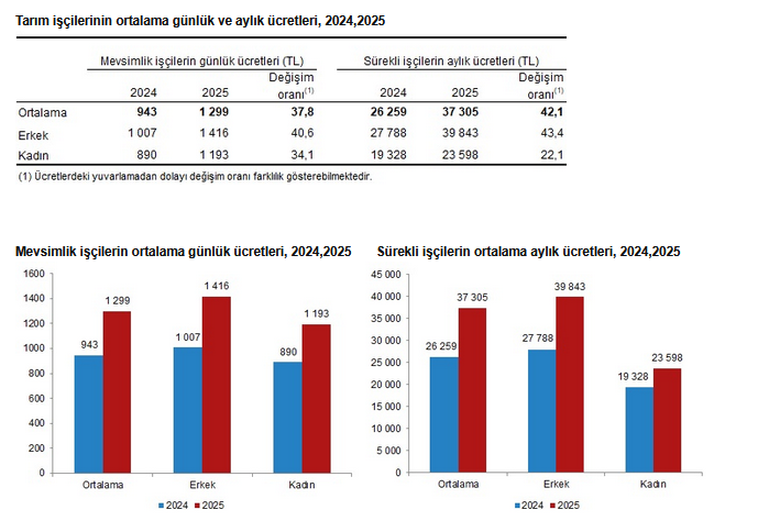 Mevsimlik erkek işçi ücretleri yüzde 40,6 artış göstererek 1 416 TL'ye, kadın işçilerin günlük ücretleri ise yüzde 34,1 artış göstererek 1 193 TL'ye çıktı.