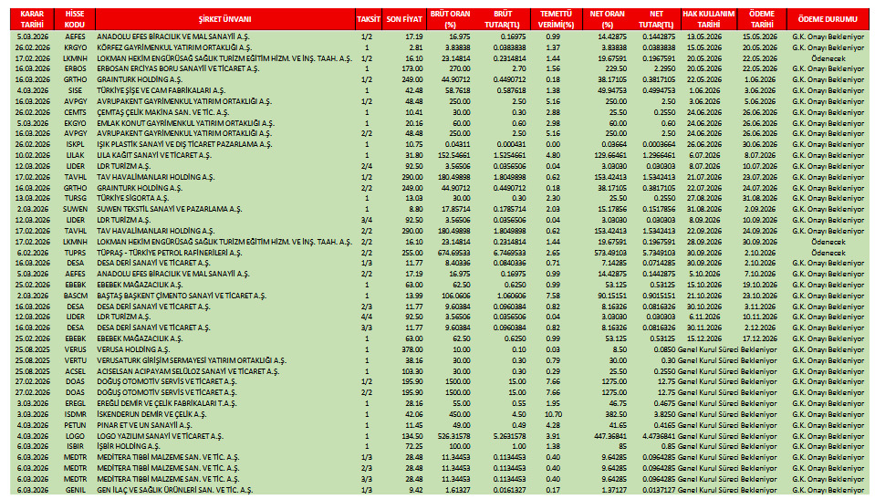 Alnus Yatırım'ın raporuna göre, şirketlerin dağıtmayı planladığı nakit temettü tutarı, temettü dağıtım tarihi ve temettü verileri şu şekilde: